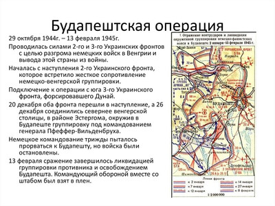 Будапештская наступательная операция – стратегическая операция советских войск в ходе Великой Отечественной войны, проведенная с 29 октября 1944 года по 13 февраля 1945 года силами 2-го и 3-го Украинских фронтов. Целью сражения стало освобождение Будапешта и вывод Венгрии из войны.